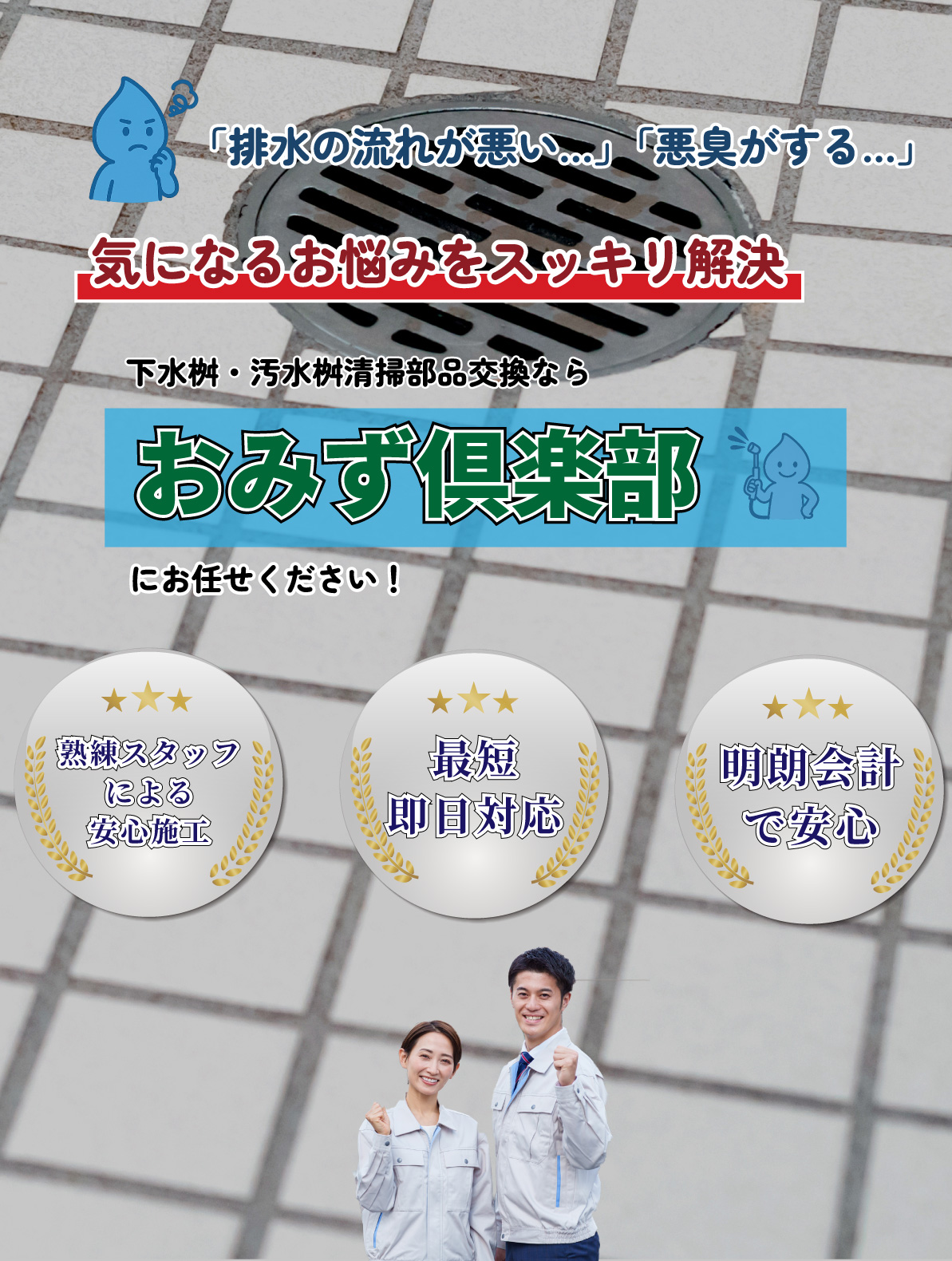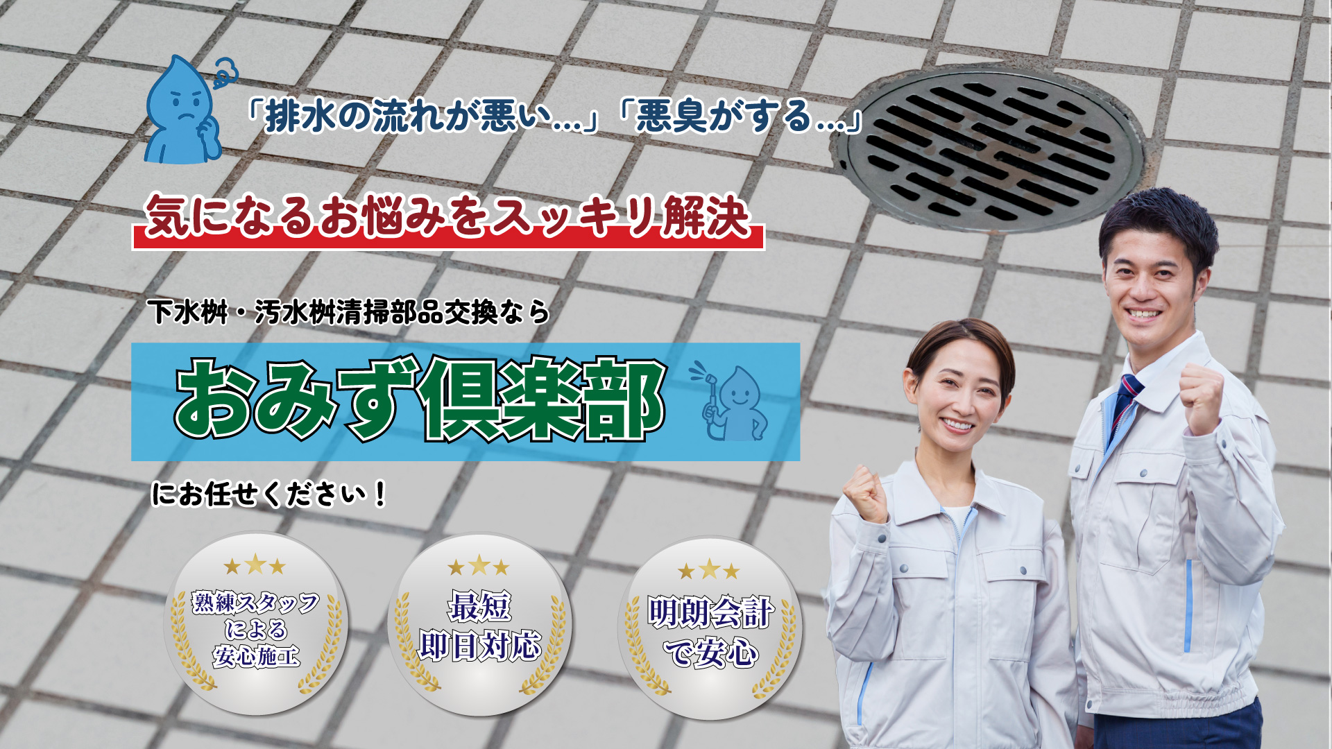 「排水の流れが悪い」「悪臭がする」など気になるお悩みをおみず倶楽部がスッキリ解決いたします!